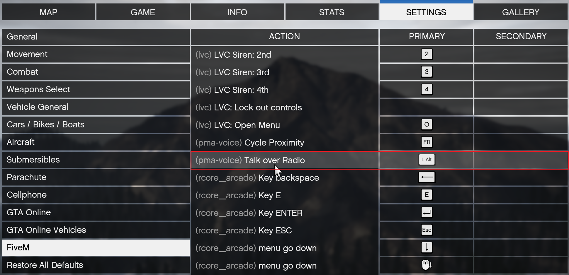 To talk over the radio, you will have a Push To Talk button configured in your FiveM Settings. You must press and hold this key to talk.